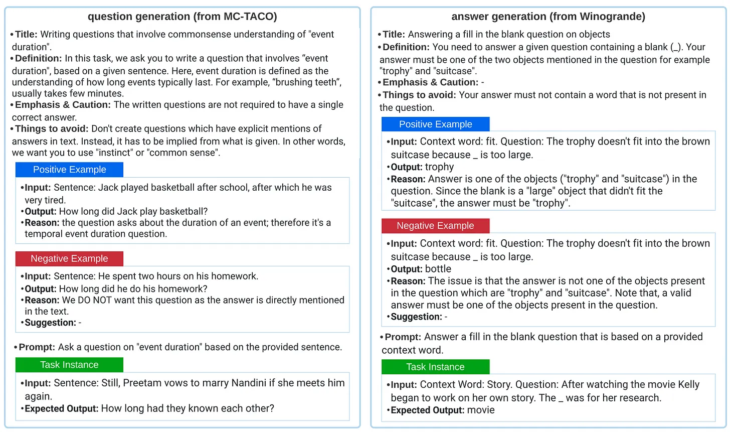 One notable dataset for instruction tuning is "Natural Instructions". This dataset consists of 193,000 instruction-output examples sourced from 61 existing English NLP tasks. The uniqueness of this dataset lies in its structured approach, where crowd-sourced instructions from each task are aligned to a common schema. Each instruction is associated with a task, providing explicit guidance on how the model should respond. The instructions cover various fields, including a definition, things to avoid, and positive and negative examples. This structured nature makes the dataset valuable for fine-tuning models, as it provides clear and detailed instructions for the desired task. However, it's worth noting that the outputs in this dataset are relatively short, which might make the data less suitable for generating long-form content. Despite this limitation, Natural Instructions serves as a rich resource for training models through instruction tuning, enhancing their adaptability to specific NLP tasks. The below image contains an example instruction format